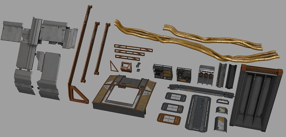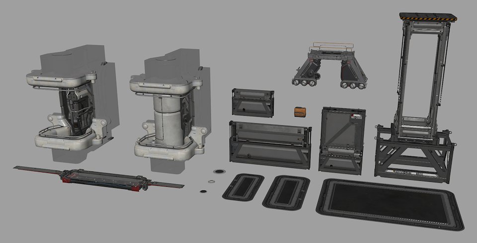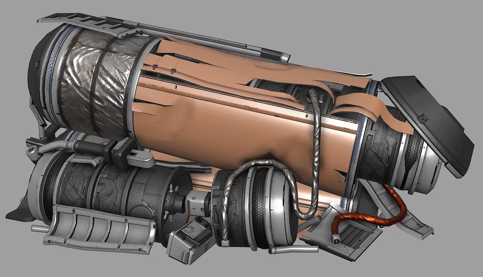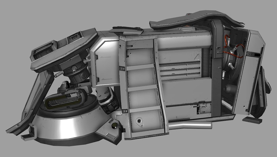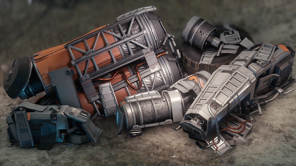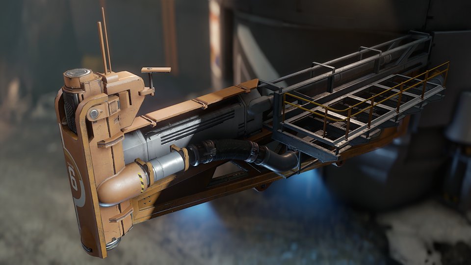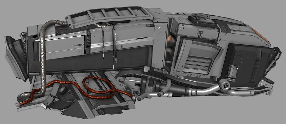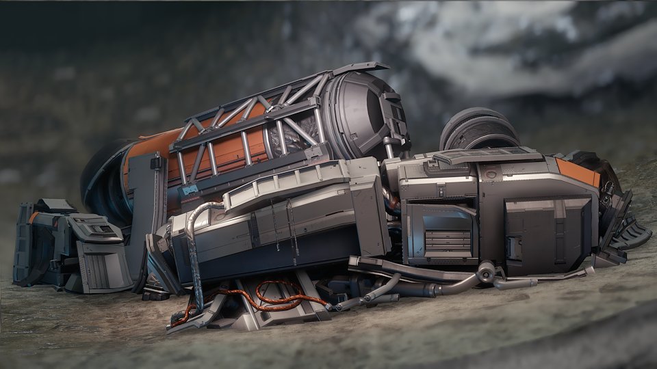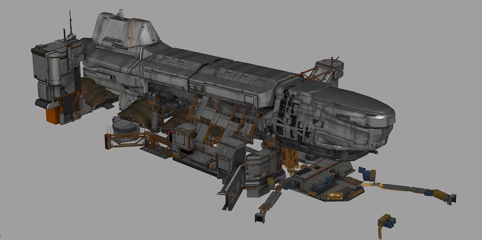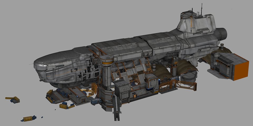 A few isolated assets that I modeled and kitbashed during the process–from the ship to most of the surrounding details.