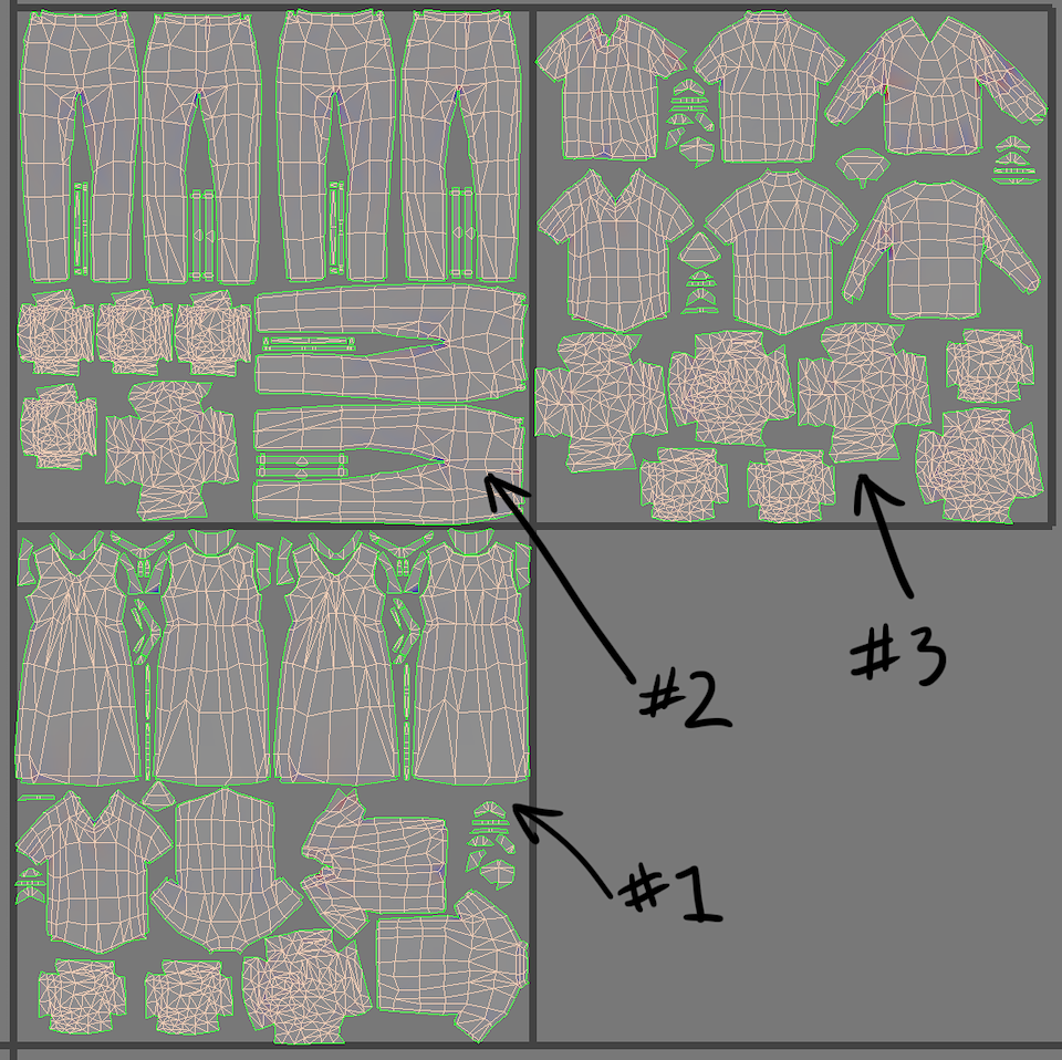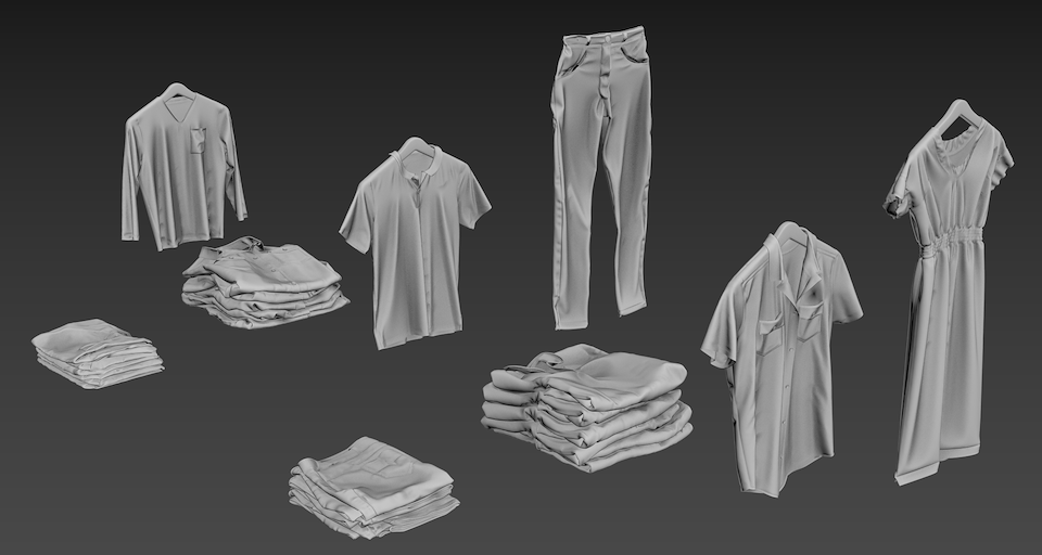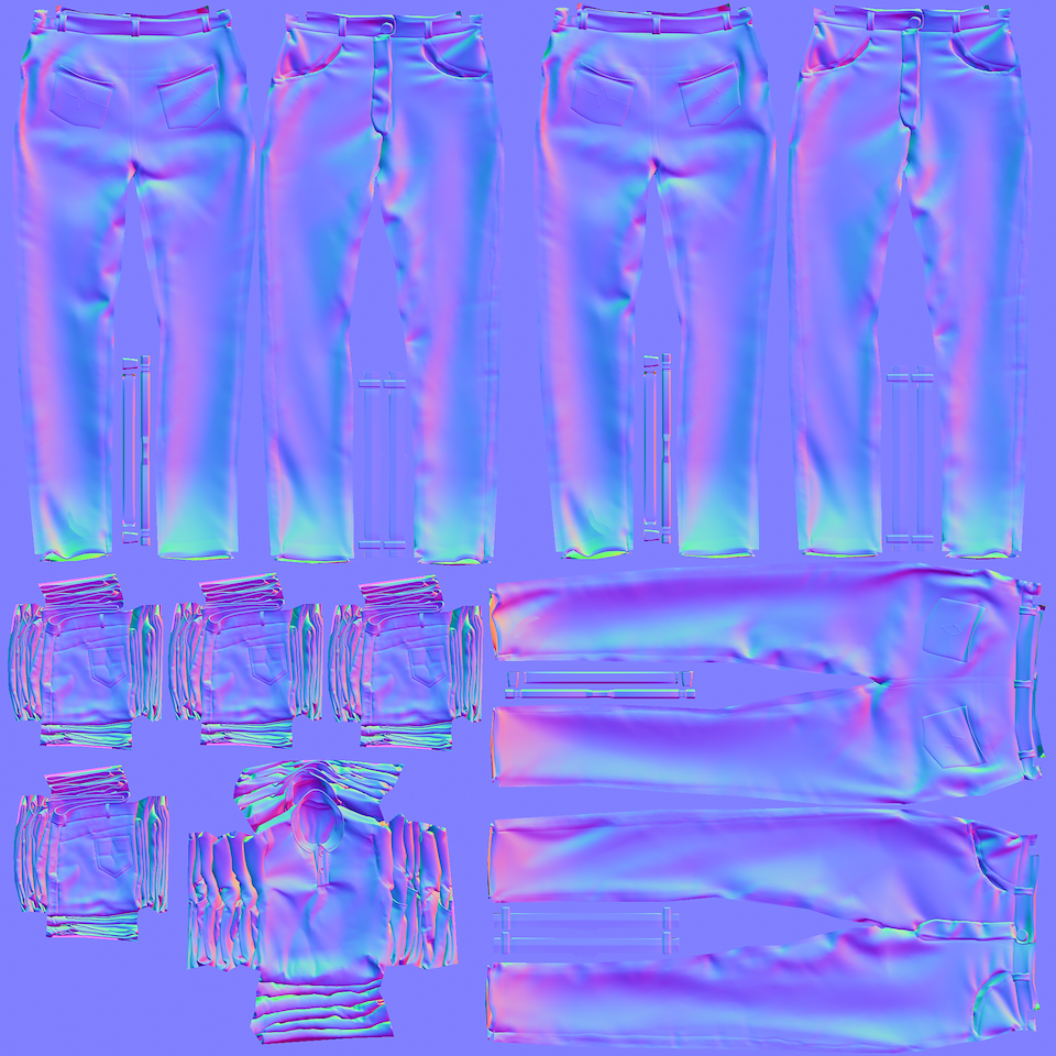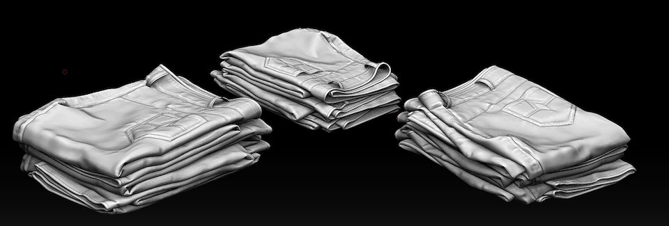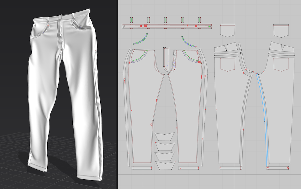 Example of jeans pattern I assembled in Marvelous Design, then stitched together, and folded through simulation. (All of the other clothing elements were created using this same process)